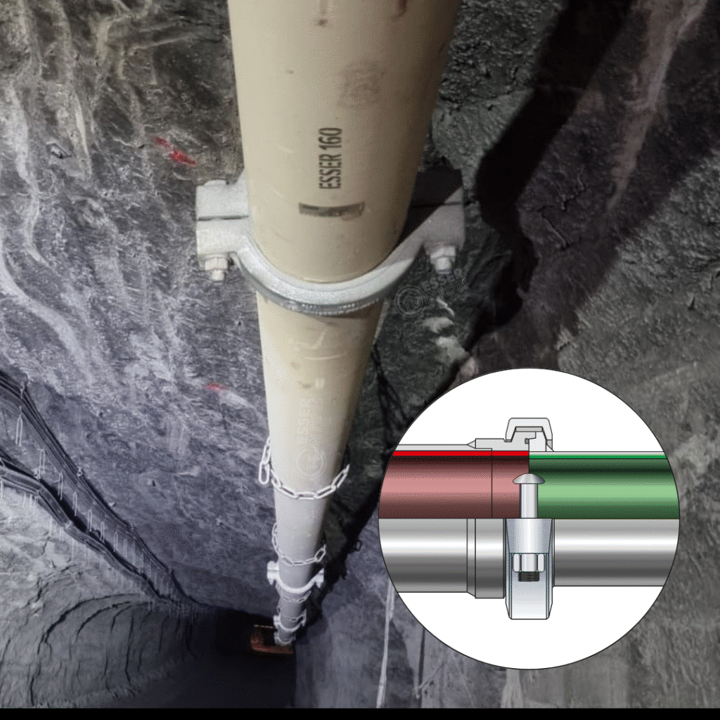 Ende 2023 wurde eine 2,8 km lange Streckenleitung für den Versatz Untertage fertiggestellt. Die dickwandigen Rohre der Serie ESSER 160 mit einer Nennweite von DN200 und der Druckstufe PN120 sind mit Hochdruckkupplungen verbunden. Die Qualität der Leitungsteile wurden mit Sicht- und Magnetpulverprüfungen nach DIN EN ISO 17638 geprüft und bestätigt. Durch Kaltwasserdruckprüfungen wurde die Druckbeständigkeit nachgewiesen. Somit ist eine reibungslose Inbetriebnahme sichergestellt worden.